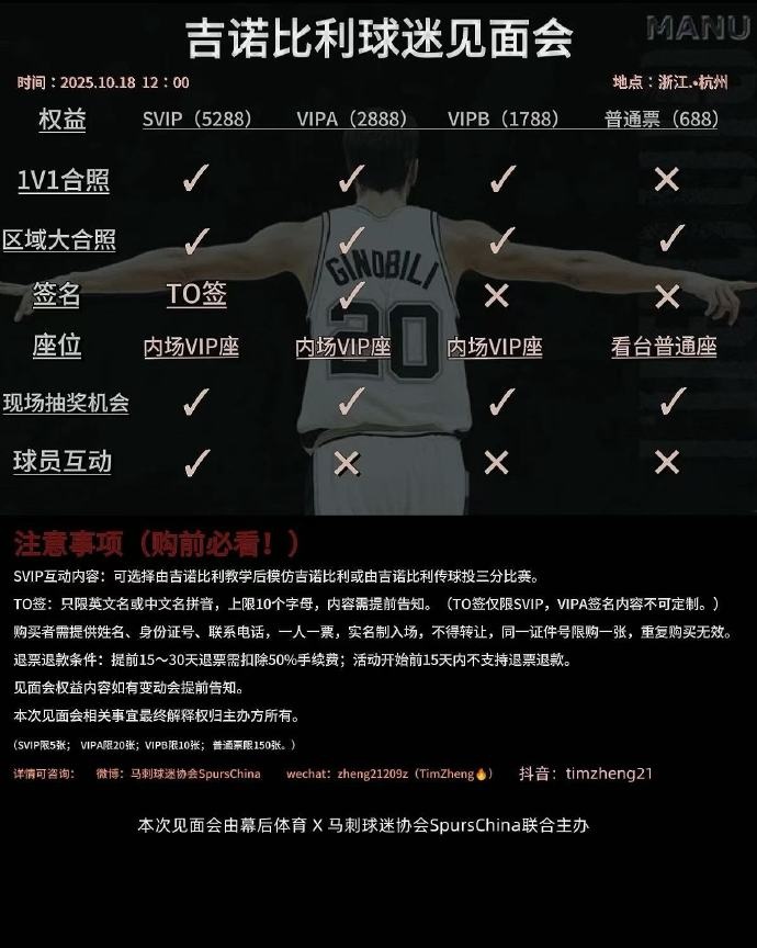 吉諾比利在杭州的球迷見(jiàn)面會(huì),SVIP票價(jià)為5288元,VIPA為2888元,VIPB為1788元,普通票為688元。