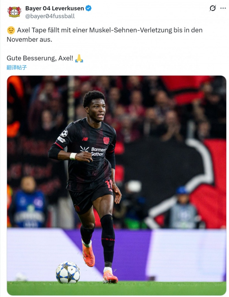 10月3日訊 勒沃庫森官方確認(rèn),隊(duì)內(nèi)18歲中衛(wèi)塔佩左大腿后側(cè)肌腱受傷,預(yù)計(jì)11月國際比賽日之后回歸。