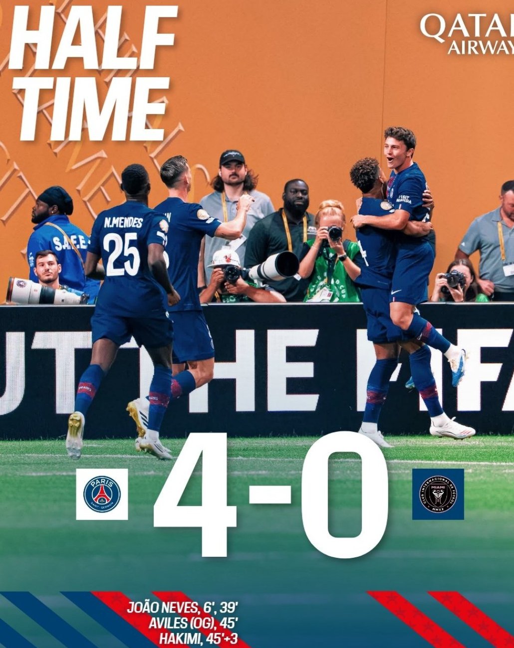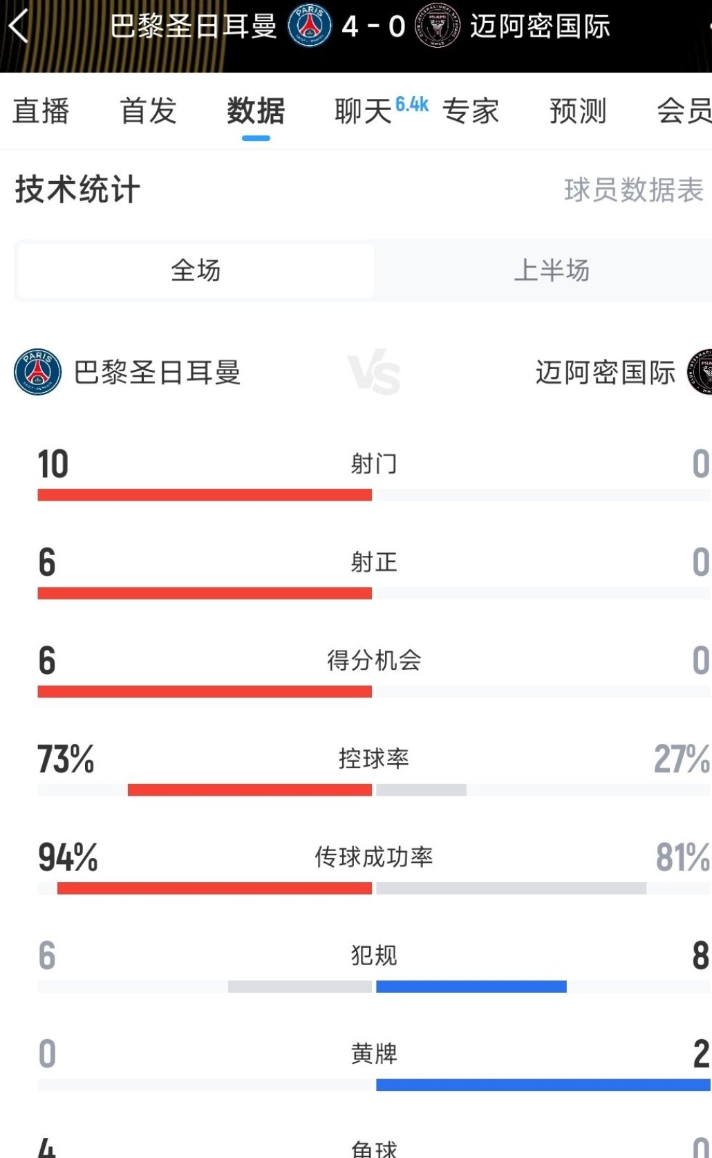 06月30日訊 世俱杯1/8決賽,巴黎圣日耳曼vs邁阿密?chē)?guó)際。上半場(chǎng)比賽結(jié)束,巴黎4-0領(lǐng)先邁阿密。半場(chǎng)數(shù)據(jù)如圖所示。