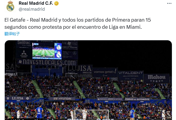 10月20日訊 西甲第9輪,皇馬客戰(zhàn)赫塔費(fèi),兩隊(duì)球員開(kāi)場(chǎng)暫停15秒以抗議西甲海外賽,皇馬也在社媒和官網(wǎng)發(fā)文。