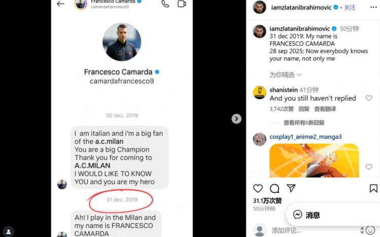 這條消息可以追溯到2019年12月30日,當(dāng)時(shí)年僅11歲的卡馬達(dá)給伊布發(fā)消息,感謝他重返米蘭,并表示伊布是自己的英雄,希望有朝一日能見(jiàn)到他,還補(bǔ)充說(shuō)自己也在為米蘭效力。