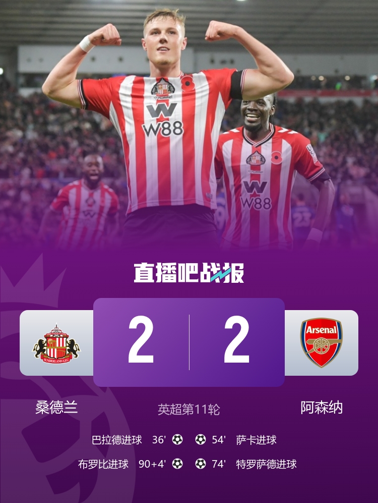 全場(chǎng)比賽結(jié)束,阿森納2-2桑德蘭。