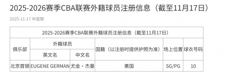 其中,北京男籃為杰曼完成注冊(cè),這也是CBA新賽季第一個(gè)注冊(cè)的外援。