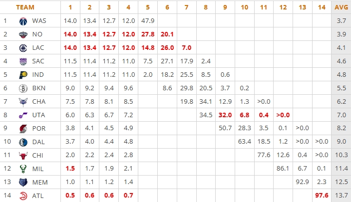 快船戰(zhàn)績來到6勝20負,排名西部倒數(shù)第二,聯(lián)盟倒數(shù)第三。根據(jù)規(guī)則,快船為雷霆抽中狀元簽的概率排在并列第一(倒數(shù)前三均為14%的狀元概率),且這個簽最差不會跌出前七順位。