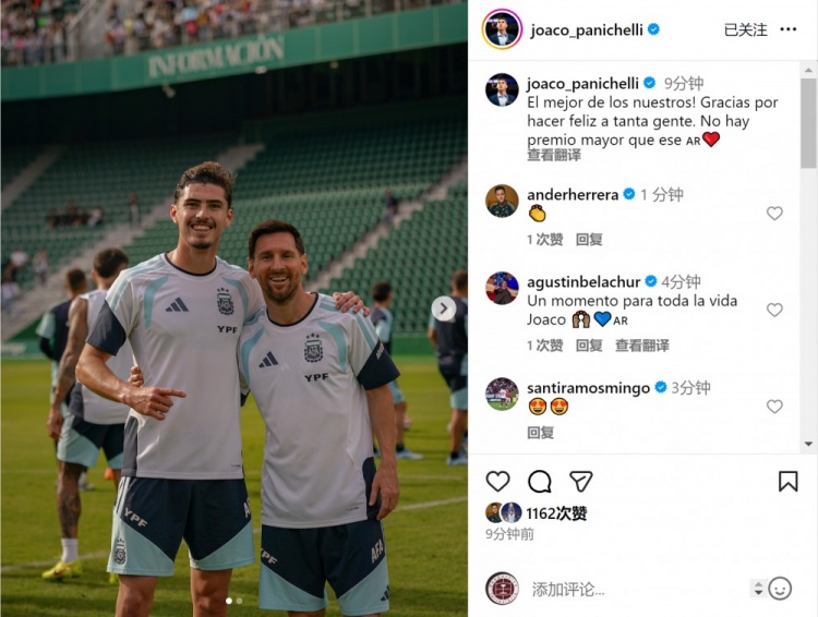 11月15日訊 阿根廷新晉國腳帕尼切利更新社媒動態(tài),曬出與梅西的合照。