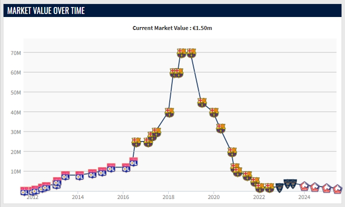 烏姆蒂蒂巔峰時身價高達(dá)7000萬歐,如今只剩150萬歐。