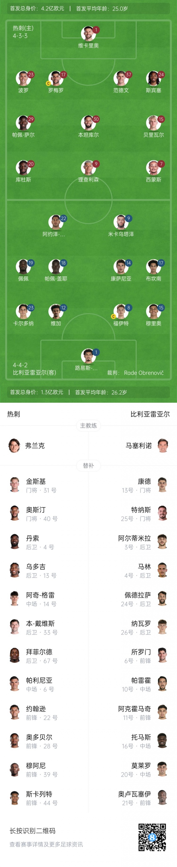 熱刺首發(fā):1-維卡里奧、17-羅梅羅、23-波羅、24-斯賓塞、37-范德文、15-貝里瓦爾、29-薩爾、30-本坦庫爾、7-哈維-西蒙斯、9-理查利森、20-庫杜斯