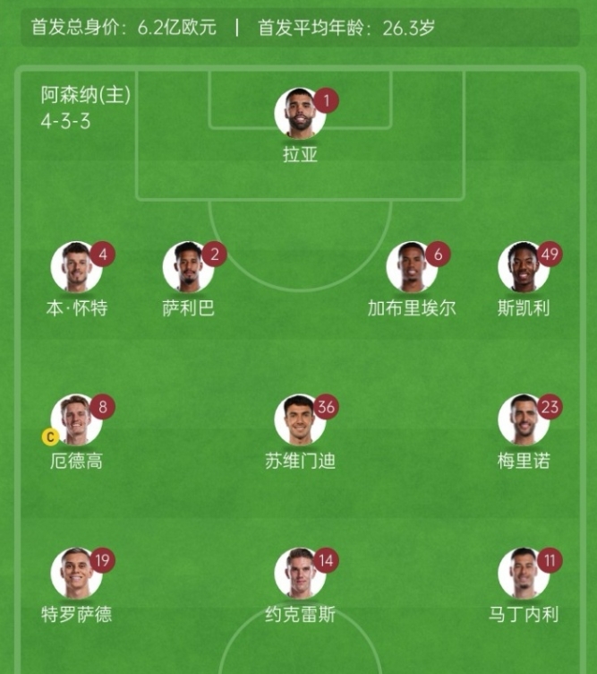 阿森納vs奧林匹亞科斯首發(fā):1-拉亞、2-薩利巴、4-本·懷特、6-加布里埃爾、49-斯凱利、8-厄德高、36-蘇維門(mén)迪、23-梅里諾、11-馬丁內(nèi)利、19-特羅薩德、14-約克雷斯