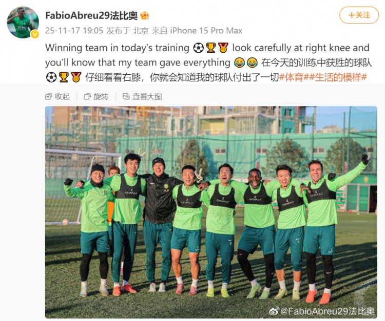 11月17日訊 國(guó)安球員法比奧更新社媒,他的團(tuán)隊(duì)在隊(duì)內(nèi)對(duì)抗獲勝。