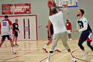 杜蘭特跳投,庫(kù)里的伸手只能防到腋下,這令人驚嘆的天賦啊