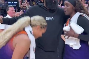 登哥開心得嘞!哈登看完女籃比賽,和兩位女籃球員分別擁抱!
